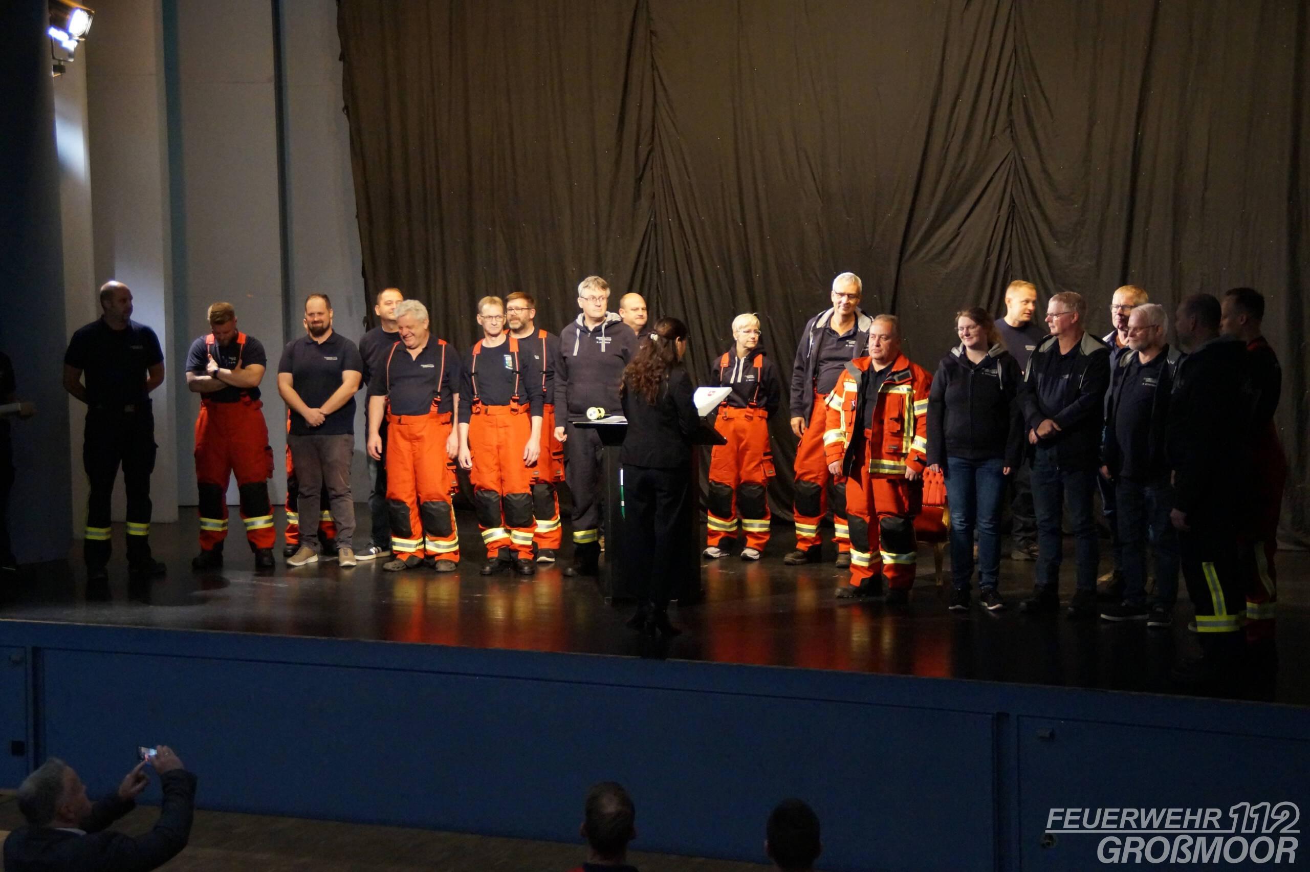 Im feierlichen Rahmen wurden am 26.09.2025 im Hagensaal in Nienhagen zahlreiche Einsatzkräfte für ihr herausragendes Engagement während des Hochwassers 2023/2024 geehrt. Die Hochwasserehrennadeln des Landes Niedersachsen wurden an alle beteiligten Kräfte der Freiwilligen Feuerwehr der Samtgemeinde Wathlingen, an Mitarbeitende des Klärwerkes, des Bauhofes und der Verwaltung sowie an Samtgemeindebürgermeisterin Claudia Sommer verliehen. Die Auszeichnung würdigt das außergewöhnliche Engagement und den unermüdlichen Einsatz, den die Beteiligten während der herausfordernden Hochwasserlage gezeigt haben. Über Wochen hinweg waren die Einsatzkräfte gefordert, um Verwallungen zu sichern, Keller leerzupumpen, Sandsäcke zu befüllen und die Bevölkerung zu schützen. In dieser Zeit stellten nicht nur die Einsatzkräfte der Feuerwehren, sondern auch die Mitarbeitenden von Klärwerk, Bauhof und Verwaltung, als auch ehrenamtliche Helferinnen und Helfer aus der Bevölkerung ihre privaten Bedürfnisse – vor allem das Weihnachtsfest – zurück, um Anderen zu helfen. Samtgemeindebürgermeisterin Claudia Sommer, die selbst ebenfalls die Hochwasserehrennadel vom Ersten Samtgemeinderat Stefan Hausknecht entgegennahm, betonte in ihrer Ansprache: “Das Hochwasser 2023/24 hat uns als Samtgemeinde vor eine der größten Herausforderungen der letzten Jahre gestellt. Was unsere Feuerwehr, unsere Klärwerk, Bauhof- und Verwaltungsmitarbeiterinnen und -mitarbeiter sowie viele Helferinnen und Helfer in dieser Zeit geleistet haben, war außergewöhnlich. Mit dieser Ehrung möchten wir allen ein sichtbares Zeichen der Anerkennung und des Dankes überreichen.” Die Verleihung der Hochwasserehrennadeln soll nicht nur Dankbarkeit ausdrücken, sondern auch die Erinnerung an die außergewöhnliche Leistung aller Beteiligten bewahren. Besonderer Dank gilt der Firma Dickmann Catering, welche als Dank für die Leistungen während des Hochwassers die Veranstaltung unentgeltlich kulinarisch abrundete, sowie allen anderen Organisatoren.